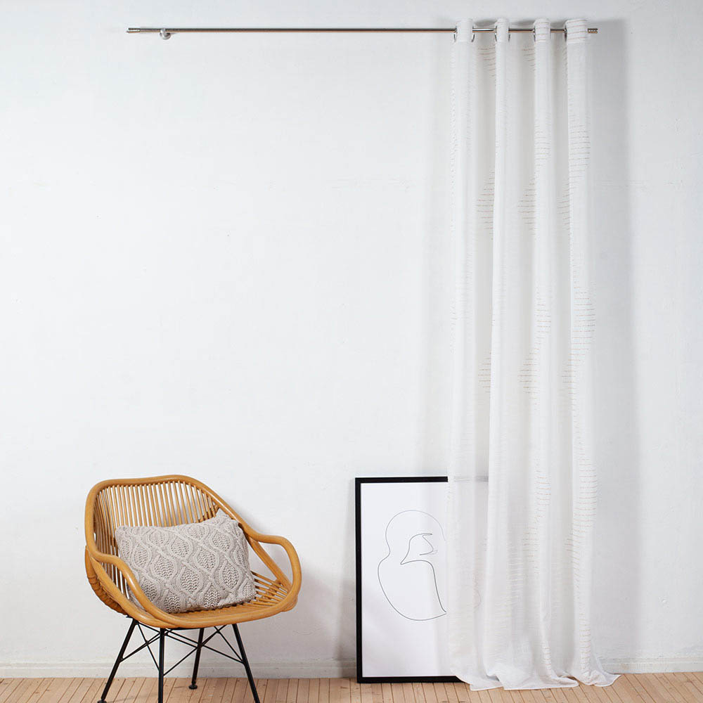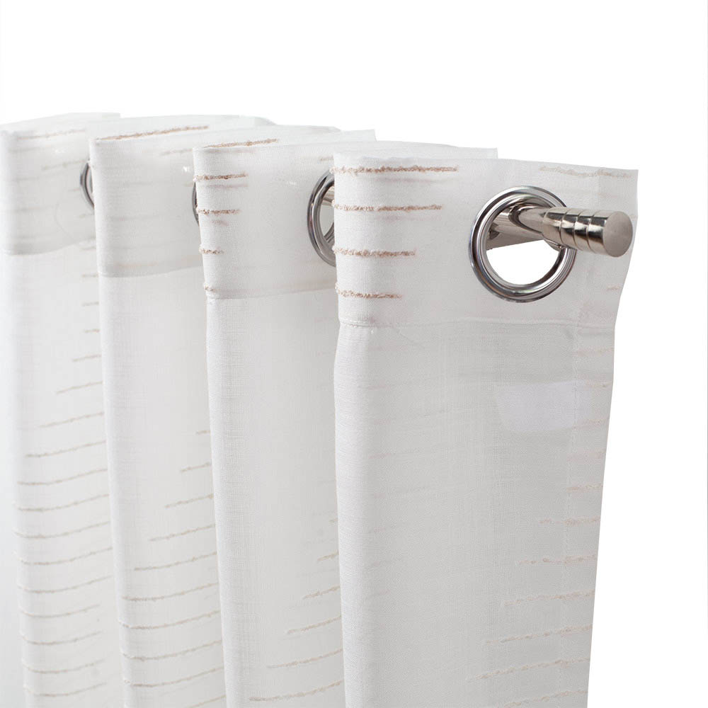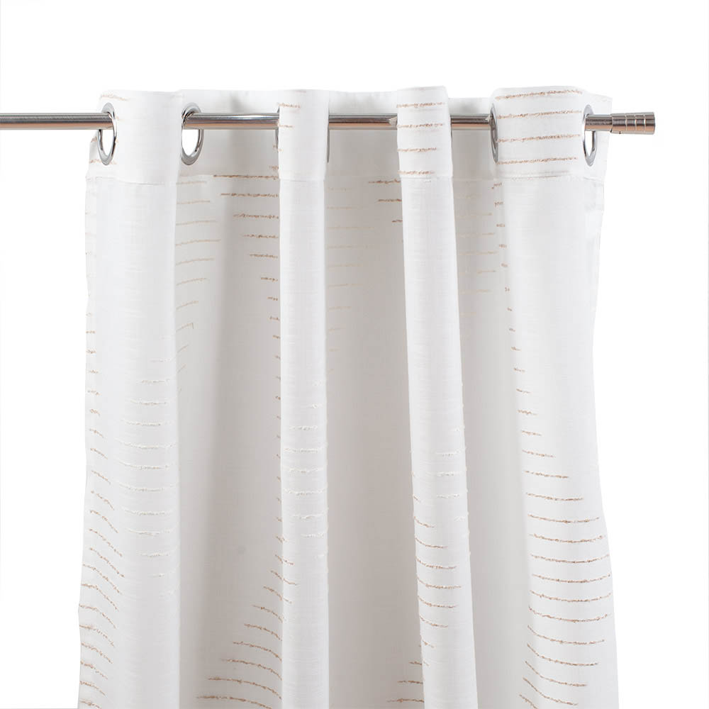 Der Fertigschal Verdi in Weiß mit dezenten braunen Streifen bringt eine helle und zugleich moderne Note in den Raum. Mit einer Breite von 140 cm und einer Höhe von 245 cm eignet er sich ideal für verschiedene Fenstergrößen. Durch die praktischen Ösen lässt sich der Schal im Handumdrehen aufhängen und leicht verschieben. Das lichtdurchlässige Gewebe sorgt für eine freundliche Atmosphäre und verleiht dem Wohnbereich ein stilvolles Ambiente.