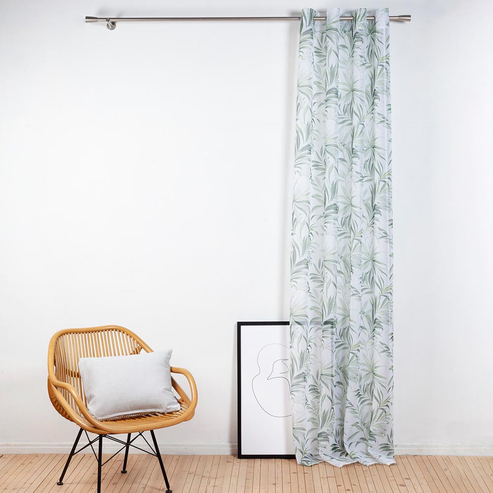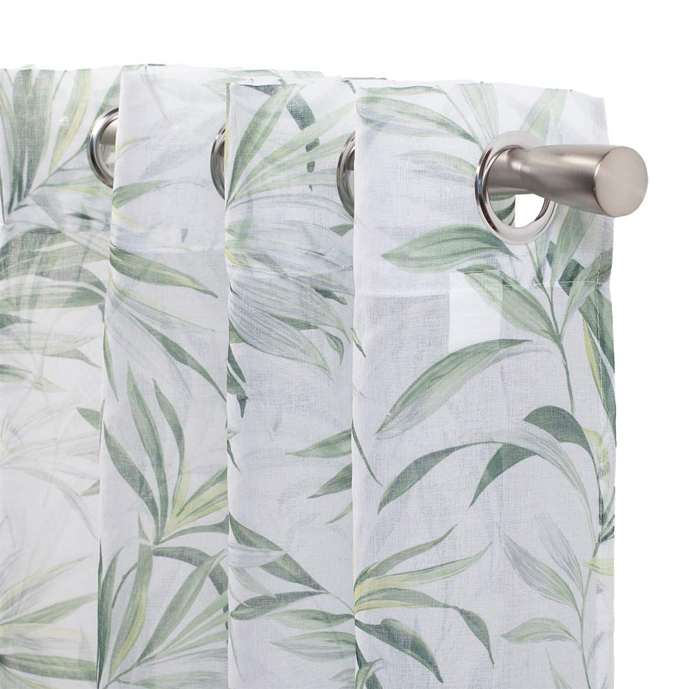 Der Ösenschal 2645 in weiß setzt mit seinem floralen Muster aus grünen Bambusblättern frische, natürliche Akzente im Wohnraum. Die transparente Stoffstruktur aus feinem Gewebe lässt viel Licht herein und sorgt für eine leichte, luftige Atmosphäre. Das dezente Design verleiht Fenstern eine elegante und zugleich lebendige Optik. Mit einer Breite von 140 cm und einer Höhe von 245 cm eignet sich der Schal ideal für Fenster und Terrassentüren. Dank der eingearbeiteten Ösen lässt sich die Gardine mühelos an gängigen Gardinenstangen aufhängen. Der Ösenschal 2645 passt perfekt zu modernen, natürlichen und hellen Einrichtungsstilen.