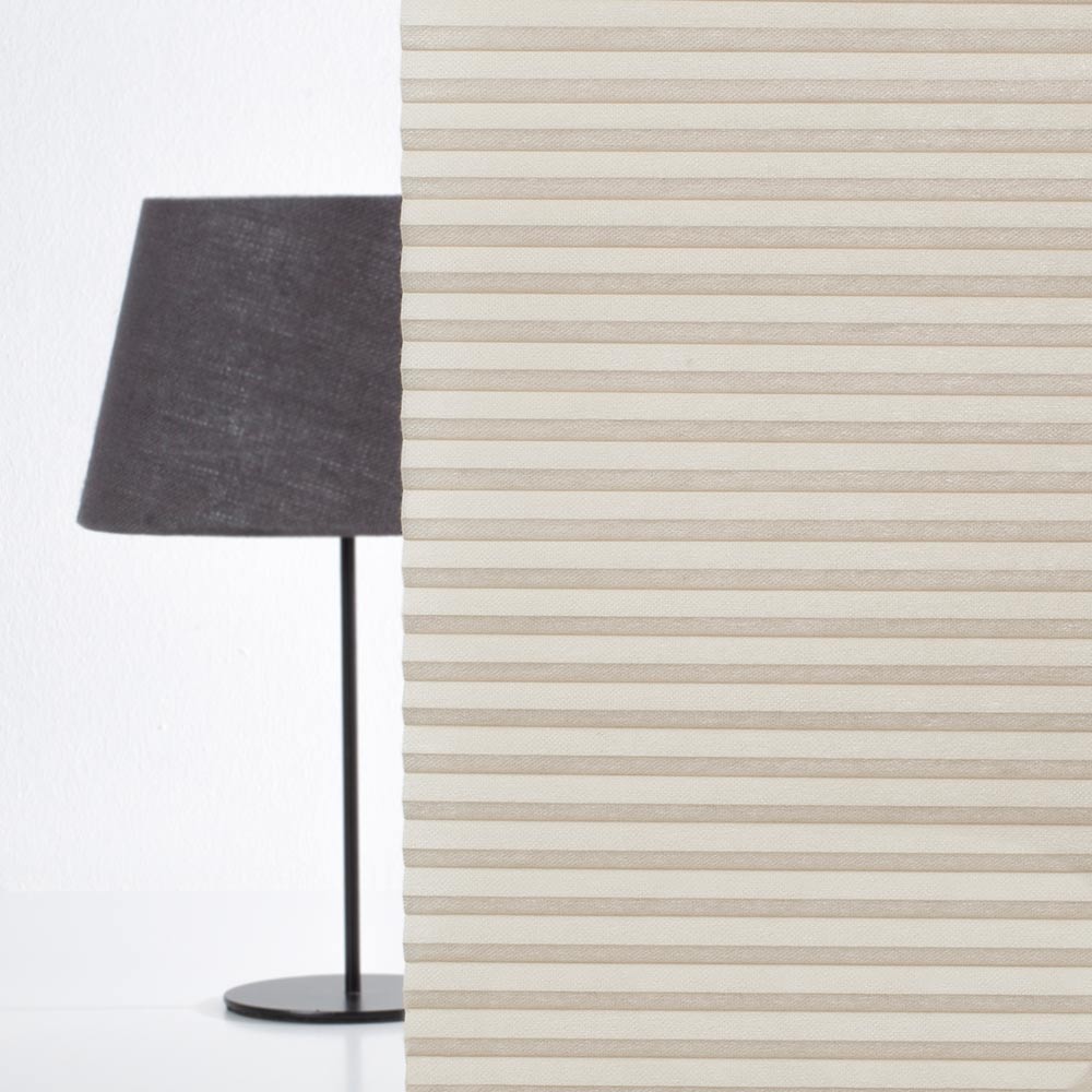 Beige Wabenplissee mit vertikalen Längsstreifen steht an einer Wand neben einer Schreibtischlampe mit schwarzem Lampenschirm. Der Raum wirkt modern und minimalistisch. Plissee Frankfurt 3753