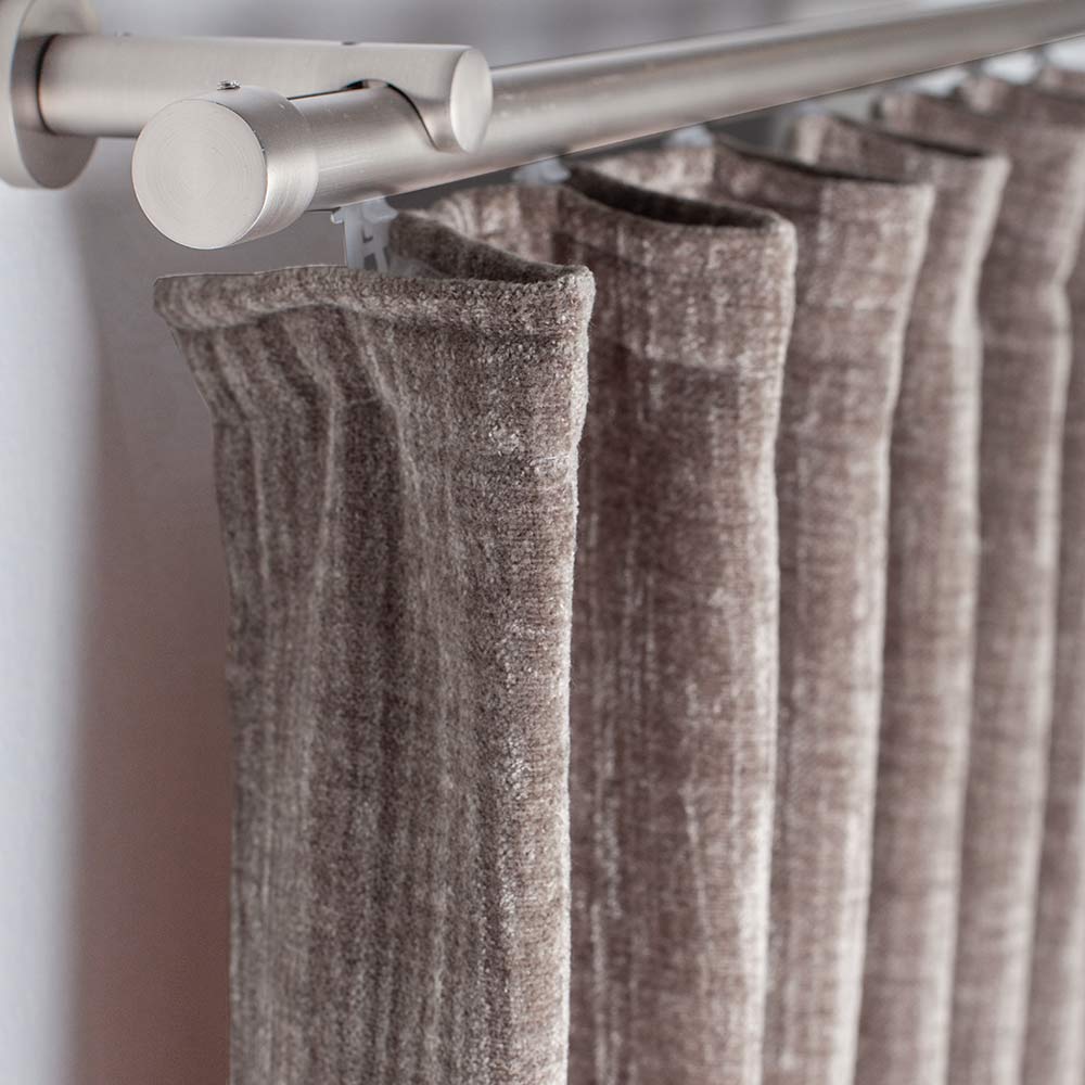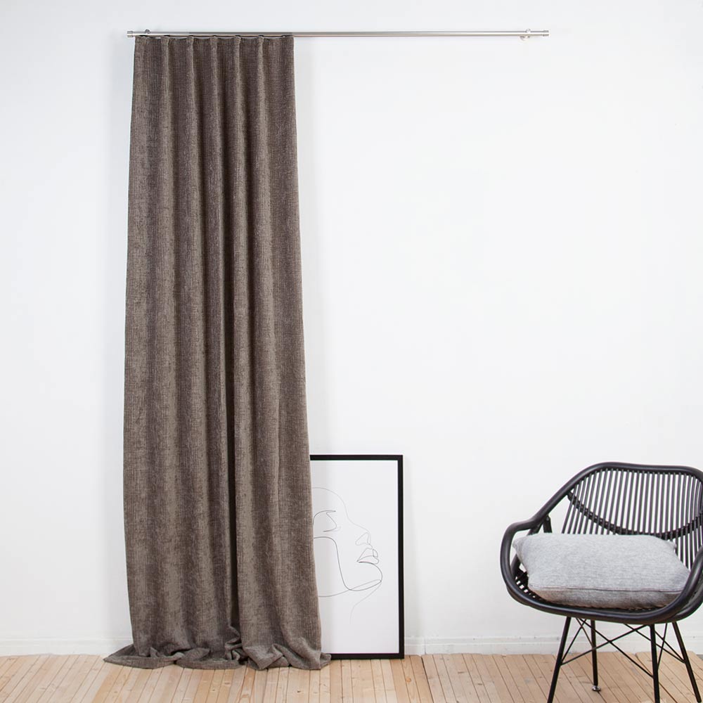Ein Vorhang für die Wärme! Der elegante Vorhang Inuit bietet, dank der schweren Stoffqualität, eine gute Unterstützung die Wärme drinnen zu halten und die Kälte an den Fenstern zurück zu halten. Er ist stark wärmedämmend und hilft somit beim Energiesparen. Der Chenille-Stoff ist dunkel meliert in der Farbe Taupe wodurch er auch recht unempfindlich ist und macht so einen eleganten Eindruck an Ihrem Fenster. Der Vorhang-Schal ist 245 cm hoch und 145 cm breit und kann mit seinem Kräuselband leicht aufgehängt werden.
