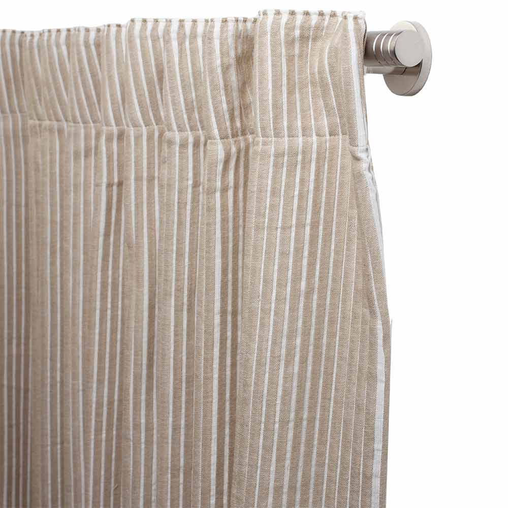 Der gestreifte Vorhang Westerland in beige hat dezente weiße Streifen. Das blickdichte Material besteht aus 100 % Baumwolle und hat einen Leinenlook. Zum Anbringen der Gardine wurde ein Durchschubband verarbeitet, so könne Sie die Raffung an Ihre Wünsche anpassen. Zusätzlich erhalten Sie ein Bügelband, um den Vorhang individuell zu kürzen. Der Schal hat die Maße 145 x 270 cm.